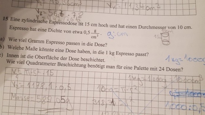 zylinder masse berechnen mit volumen mathelounge